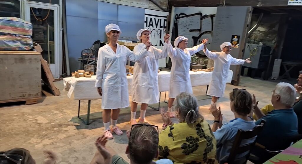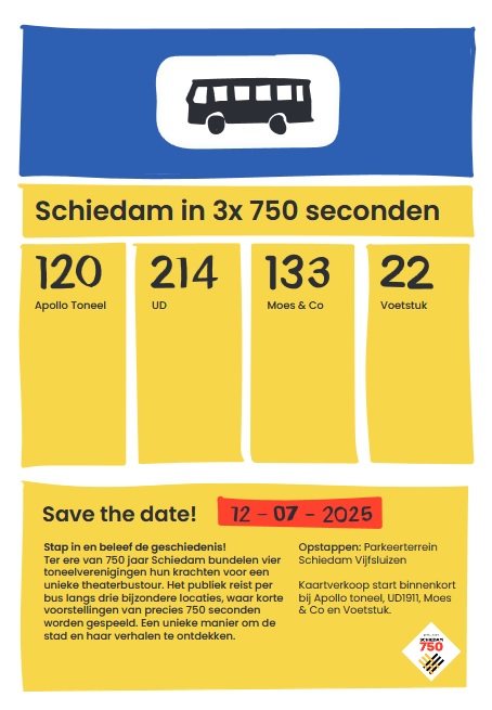 Op zaterdag 12 juli 2025 verzorgden vier Schiedamse toneelclubs een uniek samenwerkingsproject waarvan 150 bezoekers hebben genoten. In de Westvestkerk nam Apollo het publiek mee in typisch Schiedams jenever gekeuvel onder de titel ‘Proosjes gebrabbel’. In het Pronovacollege nam Voetstuk de mensen mee terug naar school in een interactief spel met muzikale internmezzo’s. En in de Sodafabriek bracht UD vier meisjes van de voormalige chocoladefabriek de Baronie tot leven. Tuissen de drie locaties reisden de mensen per bus of op de fiets. In de bussen verzorgde Moes & Co het entertainment. Alle bezoekers kregen een tasje mee voor onderweg met daarin onder meer een appel, een waterflesje en folders over Schiedam 750. De reacties waren zonder uitzondering positief.