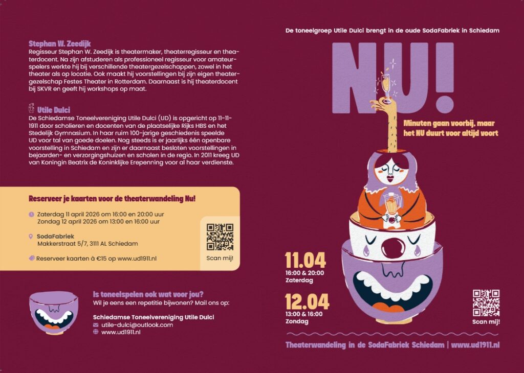 Op 11 en 12 april 2026 verzorgt de Schiedamse Toneelgroep Utile Dulci (UD) onder regie van Stephan W. Zeedijk theaterwandelingen in de SodaFabriek in Schiedam. Op zowel zaterdag als zondag zijn er maar twee wandelingen voor maximaal dertig bezoekers per wandeling door de gebouwen, dus wees er snel bij als je belangstelling hebt. De SodaFabriek bestaat uit twee oude pakhuizen ‘Coenland’ en ‘Lijfland’ aan de Buitenhaven waar van 1895 tot 1975 schoonmaaksoda werd gekristalliseerd. Na veertig jaar leegstand ontwikkelt het pand zich op een organische manier naar een eigenwijs cultureel centrum.