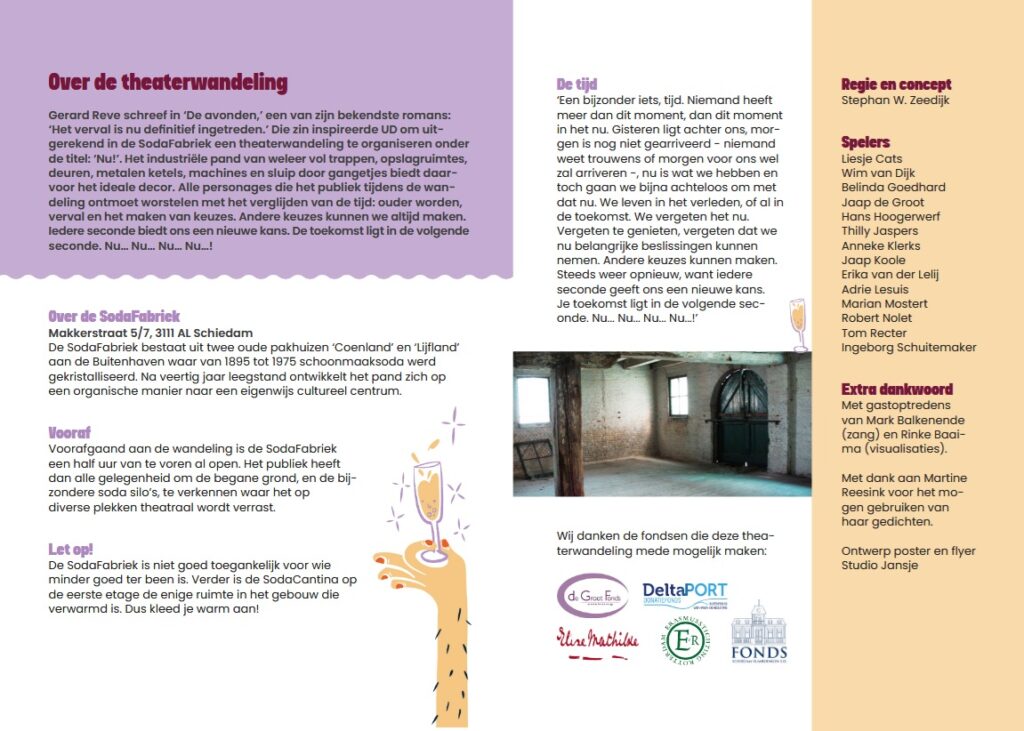 Voorafgaand aan de wandeling is de SodaFabriek een half uur van te voren al open. Je hebt dan alle gelegenheid om de begane grond en de bijzondere soda silo’s te verkennen waar je van onze ‘amuse’ kunt smullen: je wordt hier op diverse plekken theatraal verrast. Maar liefst veertien acteurs en actrices van UD zijn bij dit voorafje en de indoor wandeling betrokken. Met gastoptredens van Mark Balkenende (zang) en Rinke Baaima (visualisaties). Met dank aan Martine Reesink voor het mogen gebruiken van haar gedichten.
